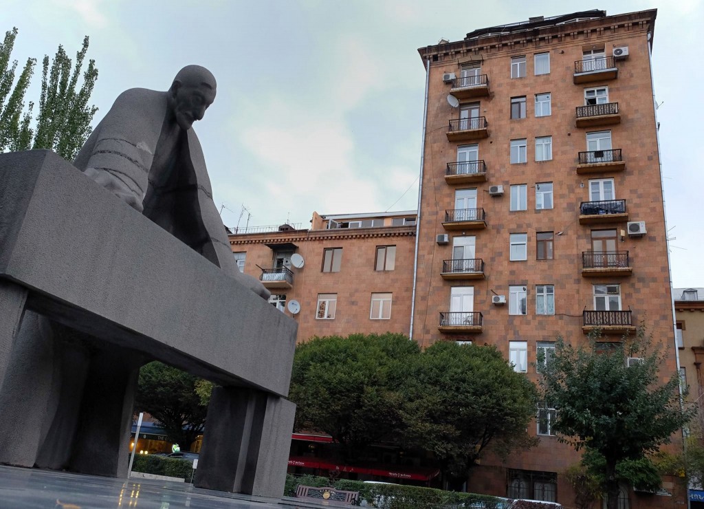 Piata si memorialul lui Andrei Saharov, in centru Erevan. Un oras fara zona istorica, dar construit in `40-`60 dupa planurile unui arhitect neoclasic, A Tamanian, a carui statuie apare mai jos pe undeva. Nu-i vorba doar de marile edificii publice, ci si de cladirile rezidentiale mai mici, chiar blocuri banale, din aceeasi piatra roz (tuf) si in stil, imitatie deliberata a templelor greco-romane. Nu vezi in toata Grecia atatea coloane, capiteluri, portice si denticuli cat intr-o zi de plimbare prin Erevan, pe strazi cu aer vag italienizant. Au mai ramas pe ici pe colo prin fostul lagar comunist blocuri socialist de garsoniere cu arhitrava elenistica, inclusiv in Bucuresti, pe la Bazilescu. Dar sunt raritati si oricum nu-s atat de multe si inzorzonate ca in Erevan.