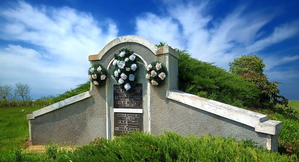 Cimitir reformat în, uel, Biharfélegyháza. Adică undeva la nord de Oradea. Interesant. Poate n-am fost eu atent dar n-am mai văzut nicăieri în altă parte morminte de felul ăsta: o mică faţadă vag barocă şi o movilă mare de pământ deasupra pe care se sădeşte un pom, o tufă de brad, etc. Morminte tumulare, cum ar veni. Fără gard, deschis în câmp, peisaj paşnic şi splendid în jur