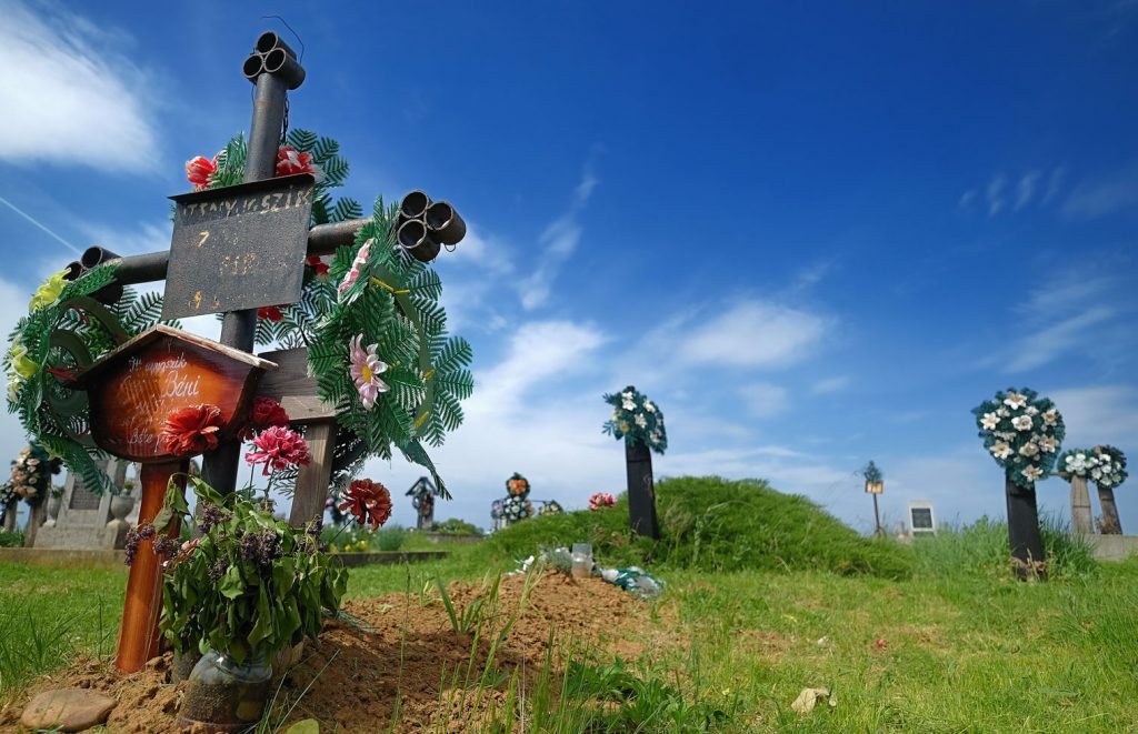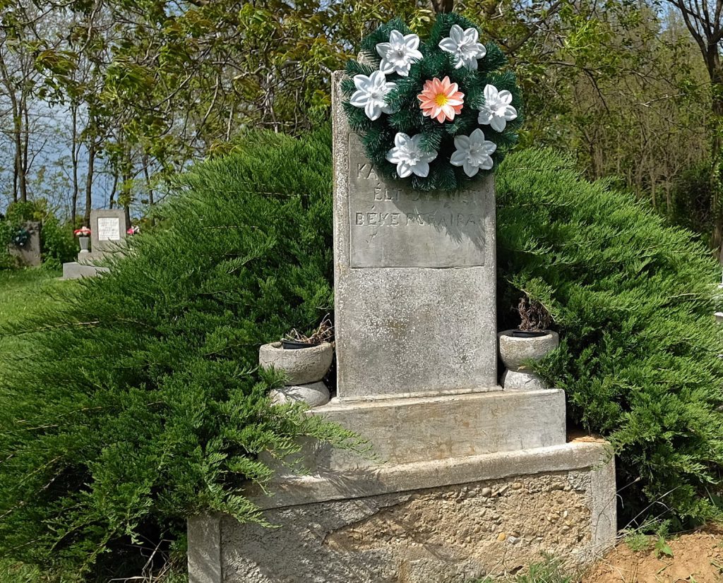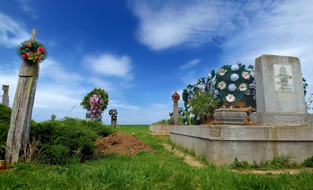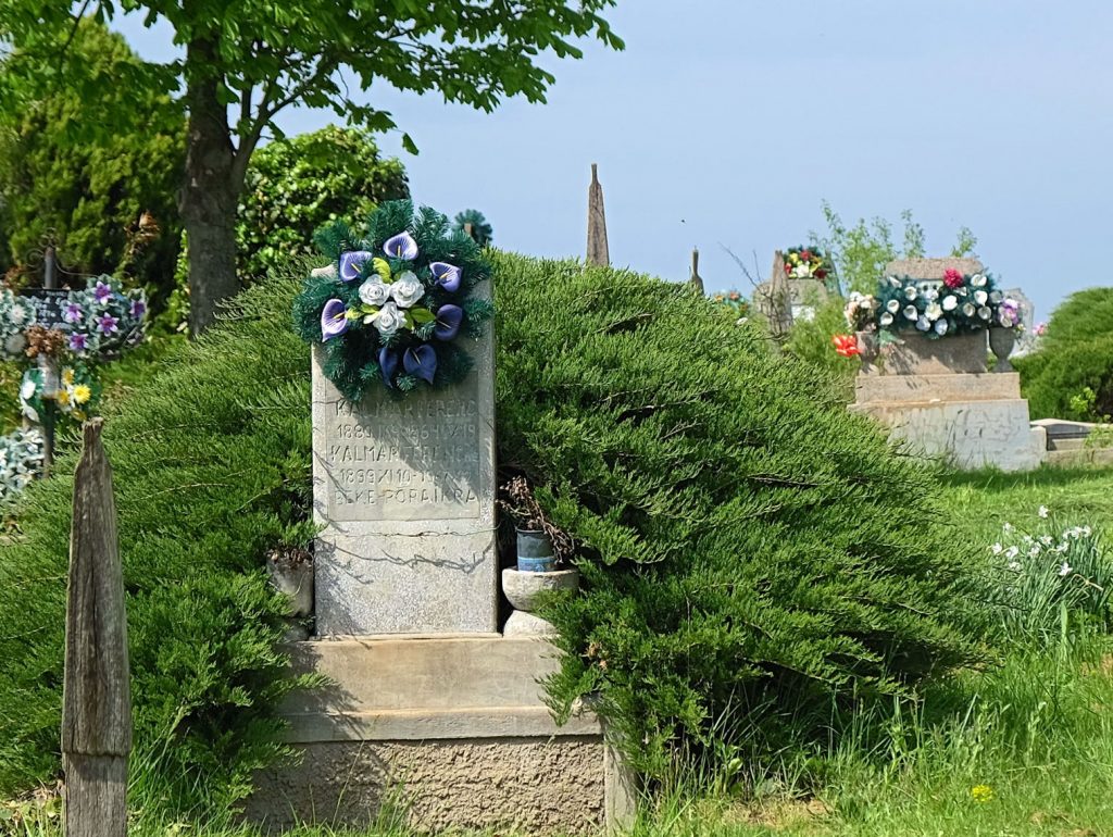Cimitir reformat în, uel, Biharfélegyháza. Adică undeva la nord de Oradea. Interesant. Poate n-am fost eu atent dar n-am mai văzut nicăieri în altă parte morminte de felul ăsta: o mică faţadă vag barocă şi o movilă mare de pământ deasupra pe care se sădeşte un pom, o tufă de brad, etc. Morminte tumulare, cum ar veni. Fără gard, deschis în câmp, peisaj paşnic şi splendid în jur