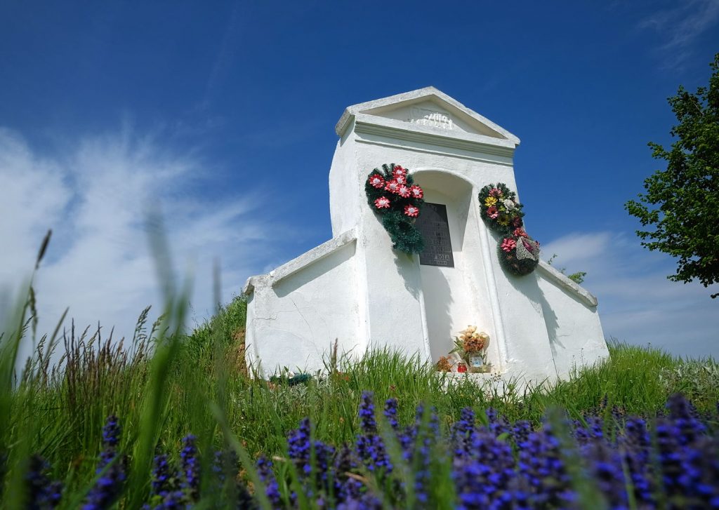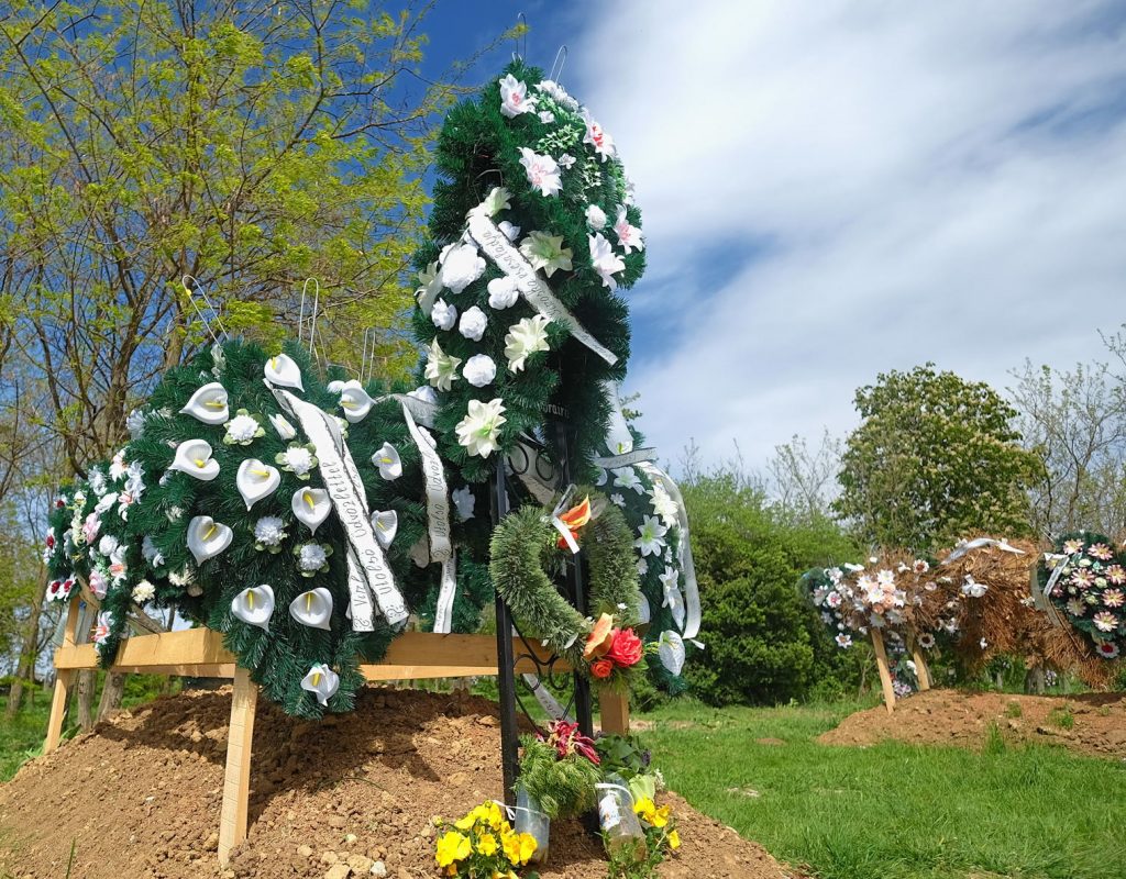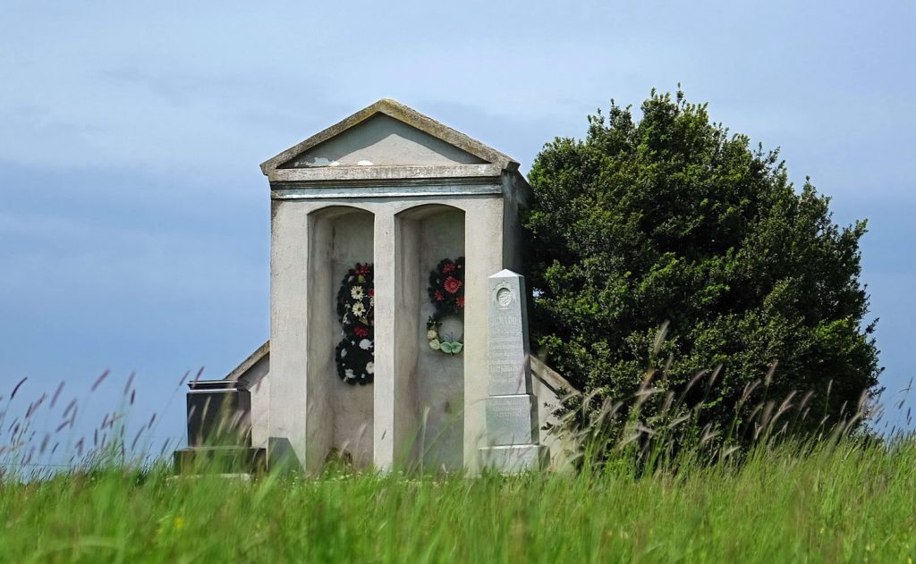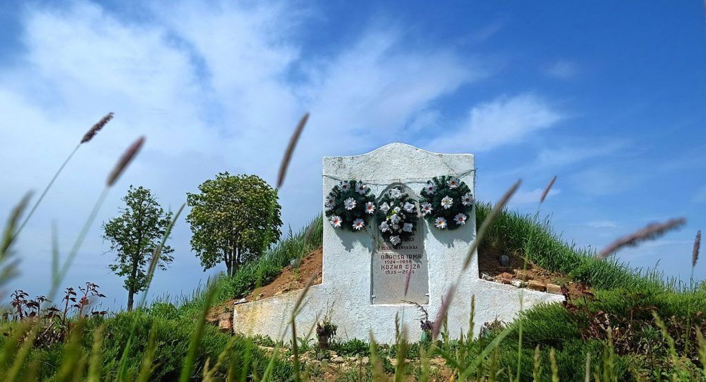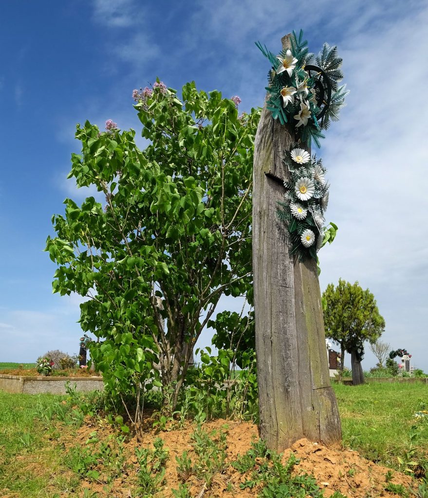 Cimitir reformat în, uel, Biharfélegyháza. Adică undeva la nord de Oradea. Interesant. Poate n-am fost eu atent dar n-am mai văzut nicăieri în altă parte morminte de felul ăsta: o mică faţadă vag barocă şi o movilă mare de pământ deasupra pe care se sădeşte un pom, o tufă de brad, etc. Morminte tumulare, cum ar veni. Fără gard, deschis în câmp, peisaj paşnic şi splendid în jur