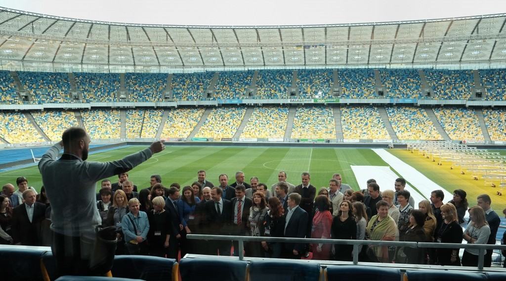 Inedit seminar de reformat Ucraina pe stadion, in loja oficiala: sediul lui Dinamo Kiev, unde s-au jucat meciurile Euro 2012. Ucrainienii sunt imens de mandri de constructie, se organizeaza si tururi ghidate al arenei Olimpiiski, dupa cum se vede. Aici putem gasi amintiri prafuite cu Miska, mascota olimpiadei sovietice ’80, deoarece o parte din competitie a fost si aici la Kiev, nu doar in Moscova. Brejnev inca traia, sau era doar proptit in geam, nu se stie. Iar vizualul era copiat din Leni Riefenstahl, ca aici se oprise imaginatia regimului. Separat, aripa cu sali mult mai moderna in care se stabilesc azi rezultatele meciurilor, toalete de avion, etc.